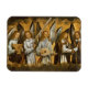 Esta obra de arte representa uno de los fragmentos de una política religiosa de Hans Memling. Esto sería del lado izquierdo de la pintura original. Imagen de arte fino del siglo XV de cinco ángeles tocando instrumentos musicales.
