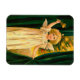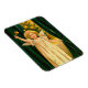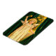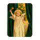 Vintage illustration of a lovely angel with white feather wings and golden hair, ringing the bell for Christmas time. On the background behind the dark green curtains is a nostalgic Christmas tree with bright burning candles.