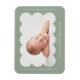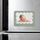Imán de anuncio de nacimiento moderno con la foto de tu bebé dentro de un marco con volutas de color verde salvia. Personaliza el imán de anuncio de nacimiento verde salvia agregando el nombre de tu bebé y otra información en letras blancas.
