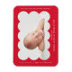 Imán de anuncio de nacimiento moderno con la foto de tu bebé en el interior de un marco con recortes rojos brillantes. Personaliza el imán de anuncio de nacimiento rojo añadiendo el nombre de tu bebé y otra información en letras blancas.