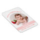 Imán de foto flexible personalizado, elegante y moderno para una nueva bebé para usar en lugar de un anuncio de nacimiento en papel para un padrino. Incluye un marco blanco con una abertura redonda para una foto horizontal personalizada, los datos de nacimiento del bebé y una banda rosa curva en la que aparecen el nombre y el segundo nombre (o nombre y apellido) de la pequeña en una fuente / tipografía de letra elegante. Este diseño incluye las palabras "Te quiero, padrino Jason!", que puedes personalizar, por supuesto.
