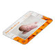 Esta hermosa y moderna tarjeta magnética de foto de recién nacido para el Día de Acción de Gracias presenta una fotografía de tu dulce bebé bajo las palabras Nuestra Pequeña Calabaza en naranja. Esta hermosa fotografía otoñal con madera blanca de moda detrás del parche de calabazas es un imán elegante para anunciar el nacimiento para Halloween o el Día de Acción de Gracias.