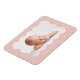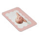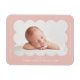 Imán moderno de anuncio de natalidad con la foto de su bebé enclavada dentro de un marco rosa de vieiras. Personalice el imán de anuncio de natalidad de color añadiendo el nombre de su bebé e información adicional en letras blancas.