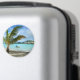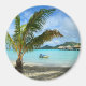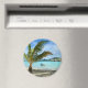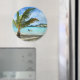Imán fotográfico redondo de recuerdo de una palmera en la playa de arena de un lujoso complejo de luna de miel con techo de paja en la isla tropical Bora, cerca de Tahití, en el archipiélago pacífico de la Polinesia Francesa.