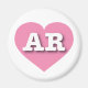 Este imán presenta un corazón fresco y rosa que contiene las letras negrita y blanca alta del funda AR, la abreviatura oficial de Arkansas, el estado natural.