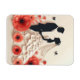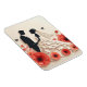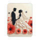 Hermosa ilustración de una pareja con ropa de boda con un fondo de amapolas rojas y mariposas negras. La pareja está en silueta, con el novio con traje y la novia con un vestido suelto con velo. La paleta de colores general es rojo, negro y blanco.