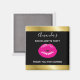 Una despedida de soltera (u otro evento) imán con un ilustracion con labios rosados calientes. Imagen audaz y vibrante. Bordes gradientes de color oro falso. Fijado sobre un fondo negro.