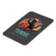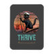 Atardecer de gato negro: un viaje al imán de la tarjeta THRIVE: un gato negro que lleva el gorra de un capitán y se pone de pie en la proa de un barco, navegando hacia una vibrante puesta de sol retro.