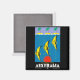 Poster de Viajes de Vintage para Australia promocionando La Gran Barrera de Arrecifes en Queensland con tres islas de peces tropicales y palmeras.
