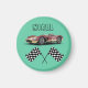 Un coche deportivo con banderas a cuadros debajo sobre un fondo verde donde arriba se puede personalizar con un nombre que lo hace único. Vacaciones deportivas divertidas.