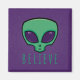 ilustracion personalizado de cabeza alienígena con grandes ojos oscuros con letras de "Believe".