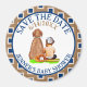 Botón personalizado marrón y azul de Guardar la Fecha con un bebé sentado junto a un perro con tema de béisbol.