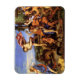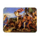 Bacchus y Ariadne de Tiziano, 1522-23, representan a la mujer Ariadna de la mitología griega, abandonada en la isla de Naxos. El dios Bacchus salta hacia ella desde su carro impulsado por un par de chitas antes de una procesión de sátiras, ninfas y juerguistas. La interacción entre los tonos cálidos de la carne y la vegetación frente al mar azul frío y las nubes ejemplifica el renombre de Tiziano como colorista. Tiziano (Tiziano Vecellio, c. 1490-1576) fue un destacado pintor del Renacimiento italiano de Venecia. Tiziano dirigió la escuela veneciana, que en contraste con el estilo clásico fresco y lineal de los florentinos era conocido por el dominio del color, el amplio trabajo expresivo, la composición innovadora y la representación sutil y expresiva de la forma humana. Tiziano amplió los logros del Alto Renacimiento Italiano y se convirtió en uno de los pintores más influyentes de todo el arte occidental.