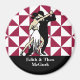 Diseño de bailarinas de tango de estilo retro con texto personalizable. El fondo es un patrón geométrico marrón / borgoña y blanco.