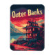 Una encantadora y nostálgica representación de las Bancas Exteriores, Carolina del Norte, conocida por sus playas extensas, sus faros históricos y su encanto costero. El diseño captura la belleza natural de la región con sus costas arenosas, dunas onduladas y monumentos emblemáticos como el faro de Cape Hatteras, todo ilustrado con un estilo vintage. Este trabajo evoca la atmósfera tranquila y pintoresca de las orillas exteriores, invitando a los espectadores a experimentar su encanto atemporal y su atractivo costero.