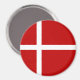 La bandera roja y blanca de Dinamarca, o Dannebrog, tiene una cruz nórdica o escandinava. El rojo es el fondo, la cruz es blanca. La bandera danesa se muestra aquí en un imán redondo.