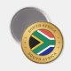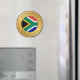 La bandera sudafricana se inserta en un anillo de oro falso redondeado. Las palabras "Sudáfrica" aparecen en la parte superior e inferior del diseño y tienen un efecto apretado. El par de tres estrellas decorativas se han diseñado con un efecto prensado.
