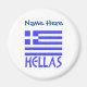 Imán redondo que muestra la bandera griega y la palabra, HELLAS, debajo en azul. La bandera muestra franjas azules y blancas con una cruz azul y blanca en la zona superior derecha. Encima, añade tu nombre, también en letras azules, para un toque personalizado o crear un regalo. Ideal para celebrar el Día de Oxi.