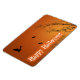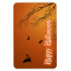 Un ilustracion de silueta de Halloween con murciélagos negros espeluznantes y árboles espeluznantes con un saludo "Happy Halloween" en un naranja místico.
