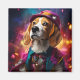Un Beagle juguetón vestido con un disfraz vibrante y caprichoso contra un telón de fondo brillante y mágico. Este encantador diseño es perfecto para los amantes de los animales.