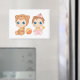 Bebés personalizados en enterizos. La de la izquierda está vestida con un traje de salto de oso marrón con una buna amarilla y una abeja minúscula. El de la derecha está vestido con un enterizo rosado con una bata amarilla y sosteniendo a un bebé sonriendo. La bola brillante descansa entre ellos.
