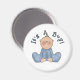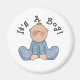 Botones de invitación para niños, camisetas, tazas, tarjetas y más con un adorable bebé con trineos azules y texto que dice "¡Es un niño!".