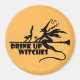 Diseño con el dicho "Beba brujas" que incluye una bruja en una escoba con un gato y un martini.
