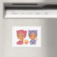 Bebés personalizados en enterizos animales. La de la izquierda está vestida con un traje de salto de oso magenta con un peine amarillo con una estrella minúscula. El de la derecha está vestido como un gato morado y sostiene a un bebé rattle en forma de campana de un gato. La bola brillante descansa entre ellos.