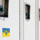 Eine Biene als Symbol der Arbeit vor dem Hintergrund der ukrainischen Flagge. Die hart arbeitenden Menschen en der Ukraine werden en der Lage sein, su zerschlagenes Land wieder aufzubauen.