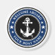 Un imán redondo elegante en blanco, negro y azul marino con un ancla náutica personalizado con estrellas y tu texto personalizado de "Welcome Aboard" y tu nombre de barco u otro texto deseado. Personalizar con tu color de fondo favorito y mucho más. Hace un gran regalo para cualquier ocasión.