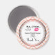 Un imán de agradecimiento con un diseño de boda moderno - labios rosados glamurosos y una ilustración de bigote masculino con estilo retro. Situado en un fondo de Chevron melocotón con un círculo superpuesto encima. El círculo tiene un borde degradado de rosa oro. El texto dentro dice Sr. y Sra. y puedes personalizar con tus nombres y fecha de boda.