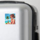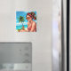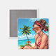 Magnate temático de verano con arte pop en la playa. Un lindo ilustracion de personalizado al estilo de un libro de historietas de una mujer con un puntito polka rojo bikini, bandana y gafas de sol.