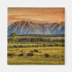 Esta foto muestra una manada de bisontes vagando libremente mientras el sol sale frente a los Grandes Tetones.