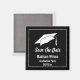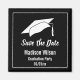 A white grad cap is above 'Save the Date" and the customizable graduate's name in white text on a black background. The Graduation party date can be changed to your party's date.
