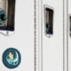 Una sirena de pelo rubio en una luna creciente con una cola de color verde azulado con agua, burbujas de agua y estrellas alrededor. Todas están decoradas en un estilo art decó.