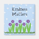 Un gran dicho inspirador que es tan cierto... flores púrpuras con hojas verdes brillantes y tallos sobre un suave fondo azul con pequeños corazones de punto blanco.