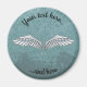 Wide open blue-gray wings illustration. Grunge blue background. Top and bottom custom text.