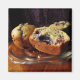 En este imán se pueden ver los muffinos de arándano azul que se abren sobre una brillante placa de vidrio colocada sobre una mesa de madera. El fondo está recubierto de una tela violeta profunda.