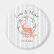 Un imán boda conmemorativo con un diseño de acuarela digital. Una silueta de reno naranja pastel dentro de una corona de hojas de hierbas. Setas y helechos forestales a sus pies. Patrón de abedul gris y blanco en el fondo.