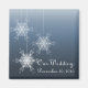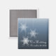 Ornamentos de copo de nieve contra gradiente azul oscuro. El texto es personalizable para otras ocasiones.
