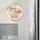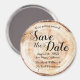 Personalice esta boda única Guardar los imanes del círculo de fechas. Cuenta con un disco de corte de grano de madera impreso, perfecto para sus bodas rústicos, naturales, de otoño o de temática botánica. Personalizar esta plantilla editable con la fecha de su boda, la ubicación, los nombres completos (novios y novios) para su boda venidero. Felicitaciones por su compromiso desde LDDESIGNLOFT.COM
