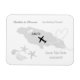 Elegante boda de destino ahorra la tarjeta de imán de fecha para las parejas que se casan en Jamaica. Con estrellas de mar y conchas, un mapa de silueta gris plateado y corazones de amor blancos. Muy bonito y fácil de personalizar con sus datos personales.
