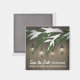 Boda de linterna de la nieve Evergreen: Salven los imanes de fecha - el diseño presenta un fondo rústico de madera con farolillos colgando de una rama de árbol verde eterno cubierta de nieve. Vea productos coincidentes en este diseño que se encuentran en la colección de esta página.