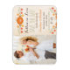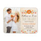 Añada su foto favorita de compromiso y foto a esta boda de otoño con temática Caída en el Amor, salvo los imanes de fecha con una calabaza, vid, hoja de otoño, peony rosa floral y bellota en un paisaje de antaño. Un corazón está tallado en el centro de la calabaza. Las iniciales o el monograma de la novia y el novio se pueden añadir al fondo del diseño. Naranjas, corales, verdes, marrones y amarillos. Pintura © Chrissy H. Studios, LLC. Todos Los Derechos Reservados.