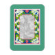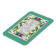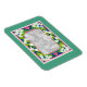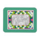 Un imán de refrigerador flexible es una novedosa manera de mantener viva la memoria de tu Día Especial, con una foto de la Pareja Feliz, enmarcada por un borde de la Flauta Naranja de Mugre en un fondo azul profundo, con corazones rosados y un amplio borde exterior verde suave. Diseño pintado a mano por Judy Adamson.