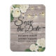 Boda Guardar las plantillas de imanes de fecha - Elegante color de agua blanco adorable Hidrángea Flores y cadenas de luz sobre fondo rústico de madera. ¡Un Diseño Perfecto Para Tu Gran Día! Todos Los Estilo De Texto, Los Colores Y Los Tamaños Se Pueden Modificar Para Ajustarse A Sus Necesidades.