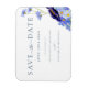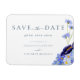 Guarde la fecha con estilo elegante con un arte único de acuarela de flores silvestres pintadas a mano y una bella tipografía que es fácil de personalizar con los nombres de los novios y la fecha de la boda. Tarjeta moderna de "save the date" de acuarela de flores silvestres para una boda boho floral de verano. Flores únicas de prado, incluyendo acianos, amapolas, cosmos y nomeolvides con delicado follaje pintado por la artista Catherine Sweetman en tonos de azul aciano, azul beis, azul marino, púrpura y verde. Ideal para el jardín botánico o una boda al aire libre en un jardín de primavera o verano en un prado. Encuentre artículos coincidentes en la suite de boda azul de flores silvestres modernas.