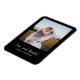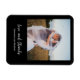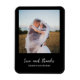 Imán de favor de boda moderno con un diseño simple y minimalista con "amor y gracias" en una elegante letra cursiva, debajo de tu foto favorita sobre un fondo negro. Estos imanes elegantes serían excelentes favores de boda para una boda con tema gótico o boda de Halloween.