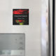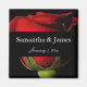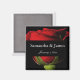 Atractiva rosa roja de tallo largo sobre imán boda negro personalizado con sus nombres y fecha.