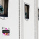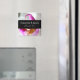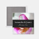 Atractivo imán boda de orquídeas blancas y violetas personalizado con sus nombres y fecha.